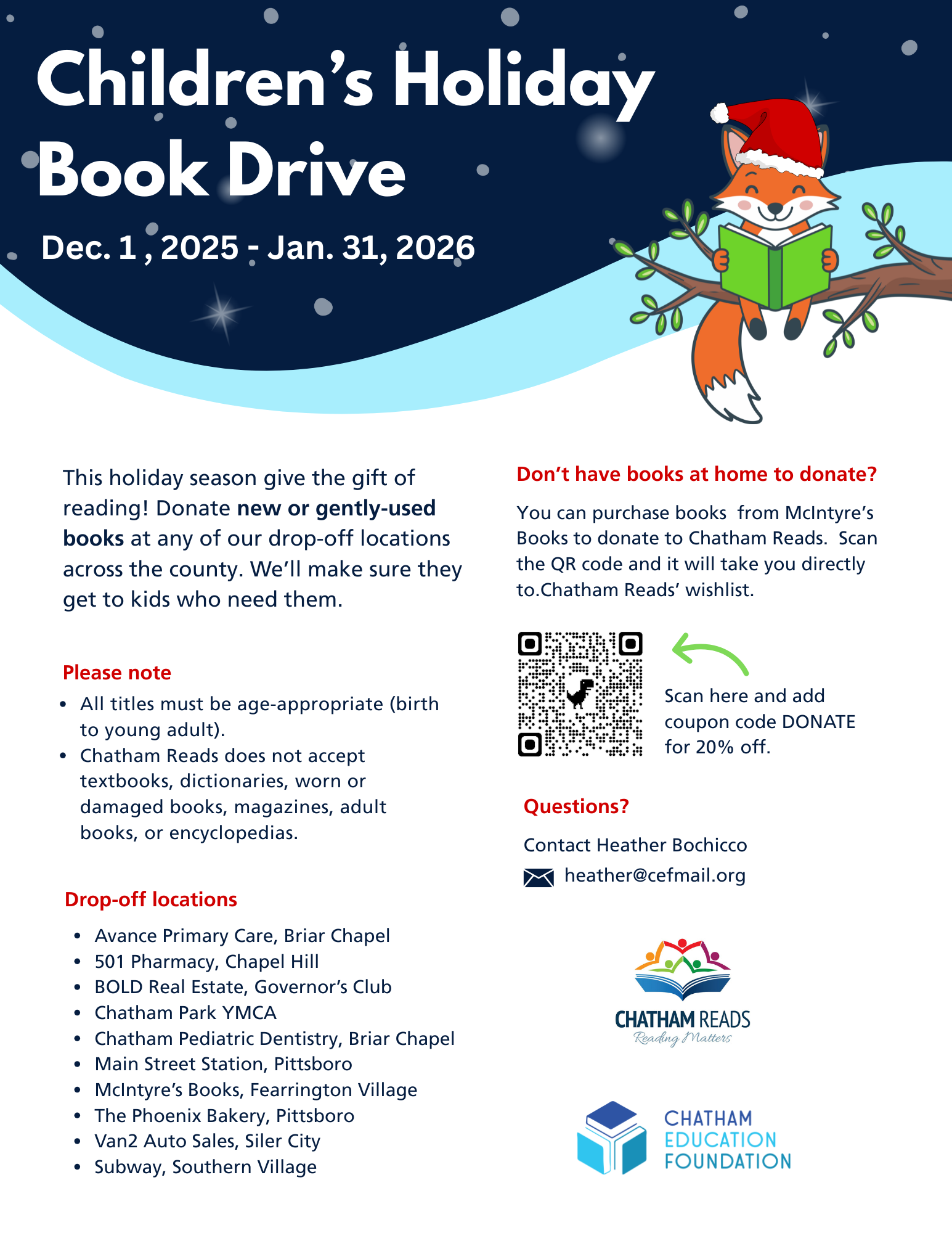 You can purchase books from McIntyre’s Books to donate to Chatham Reads. Add coupon code DONATE for 20% off.